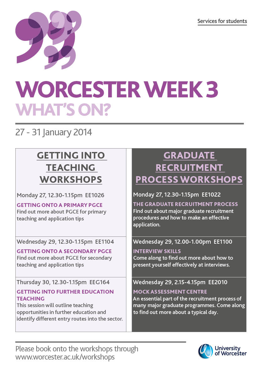 Worcester Week 3 23 January 2014 Registry Services (WHER1) SOLE, Students Leave a comment Check out what is happening during Worcester Week 3 Share this: Click to share on Facebook (Opens in new window) Facebook Click to share on X (Opens in new window) X Click to email a link to a friend (Opens in new window) Email Click to print (Opens in new window) Print Click to share on Reddit (Opens in new window) Reddit Like Loading... Related