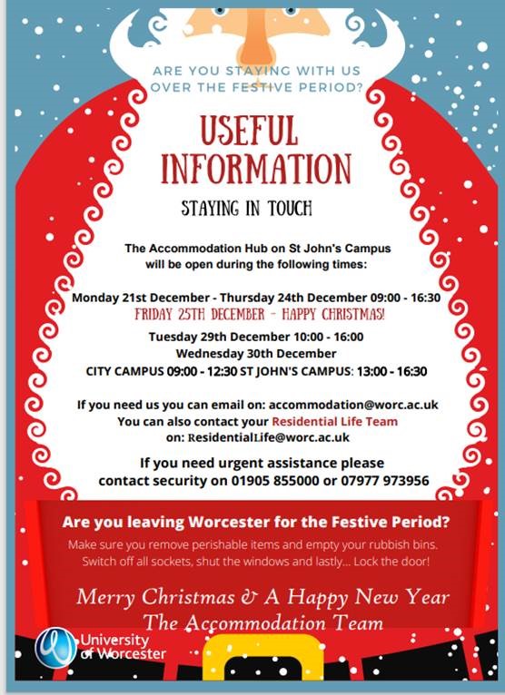 The hub will be closed between Friday 25th December and Monday 28th December 2020. During this time, if you need urgent assistance please contact Security on 01905 855000 or 07977 973956.