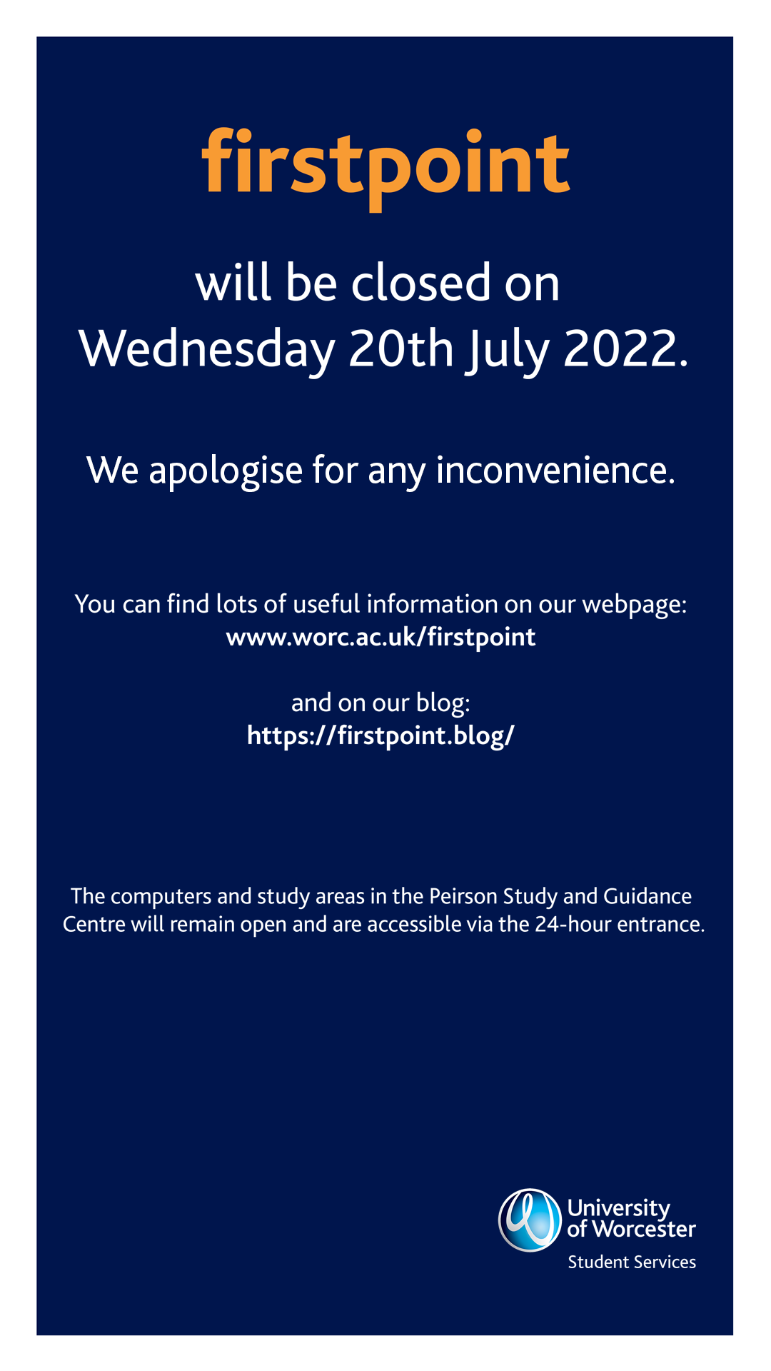 firstpoint will be closed on Wednesday 20th July 2022. We will reopen at 9.00am on Thursday 21st July 2022.