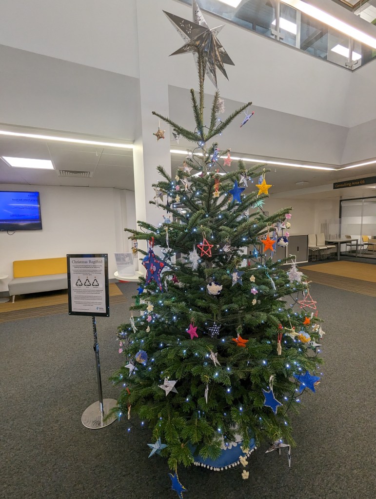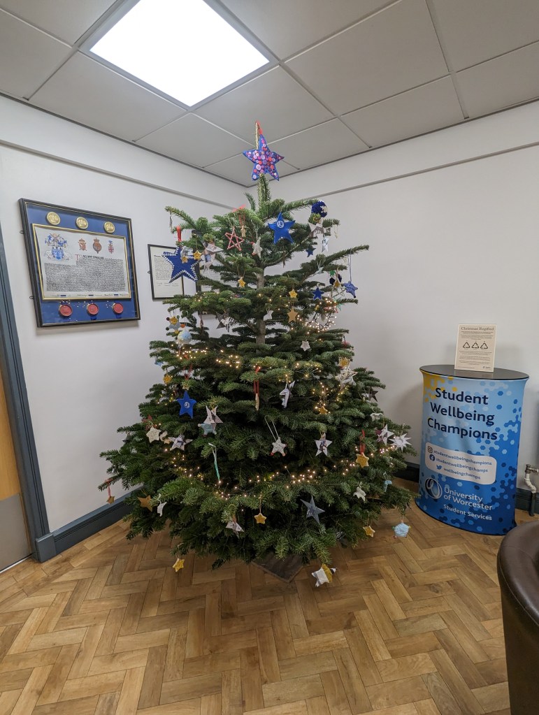 So, as you admire the unique decorations on these three trees, let each piece serve as a reminder of our commitment to both environmental consciousness and supporting the wellbeing of the students at the University of Worcester. May these displays inspire us all to find joy in creativity, while reminding us of the importance of caring for our planet and caring for ourselves during this festive season.