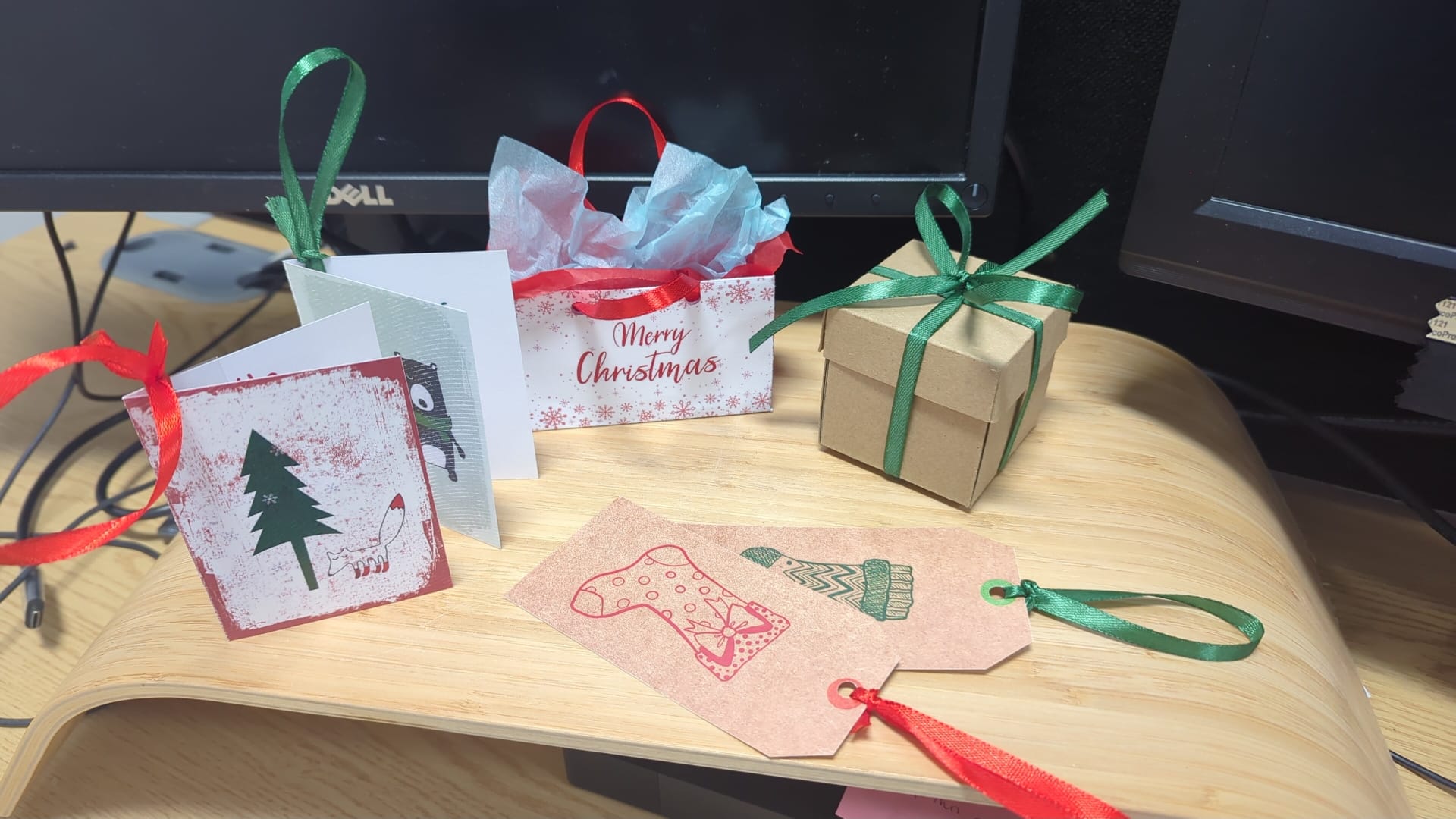 Our decorations are based on the idea of gifts and giving: gift tags, mini Christmas cards, gift boxes and gift bags. Each one is handmade, and we would like to invite students to add their own gift of a few kind words, or a kindness pledge to our carefully crafted decorations. This could be as simple as leaving a positive message for someone to read, or the promise to buy an extra item to donate to the food bank.