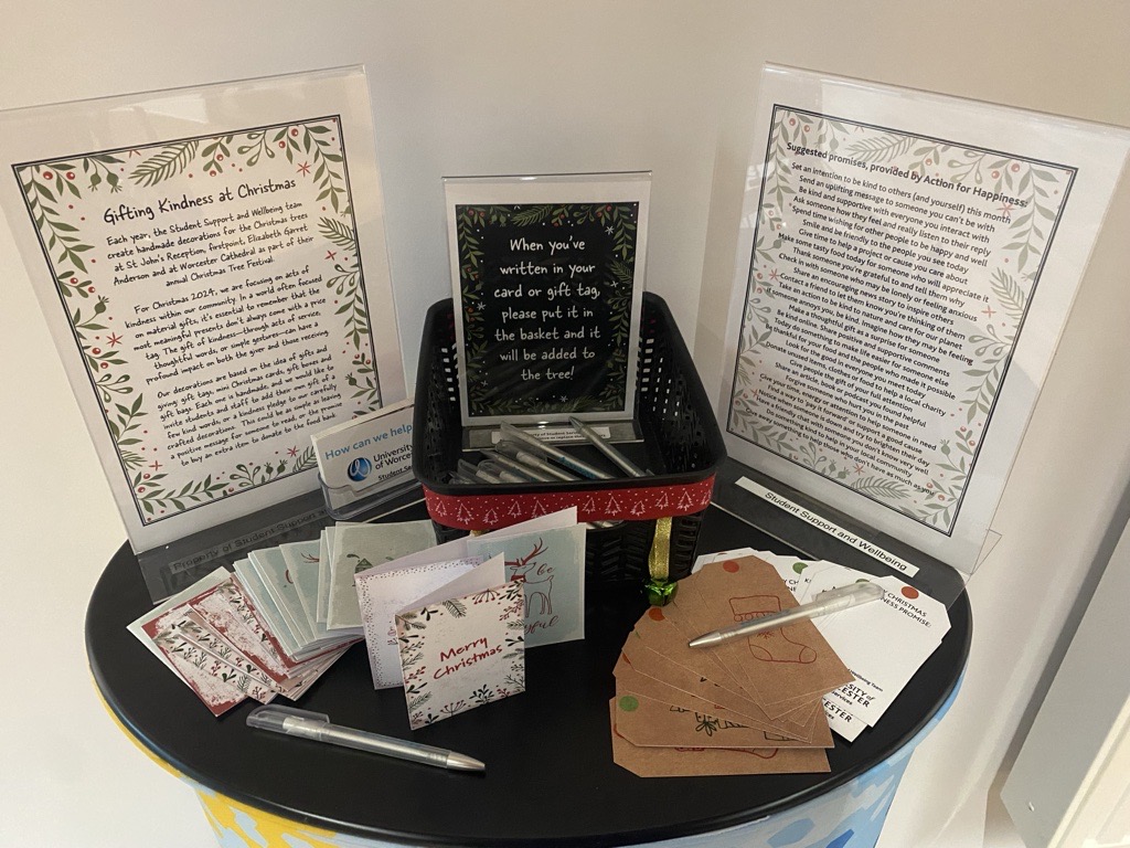 Each year, the Student Support and Wellbeing team create handmake decorations for the Christmas trees at St John’s Reception, firstpoint, Elizabeth Garret Anderson foyer and at Worcester Cathedral as part of the Christmas Tree Festival.