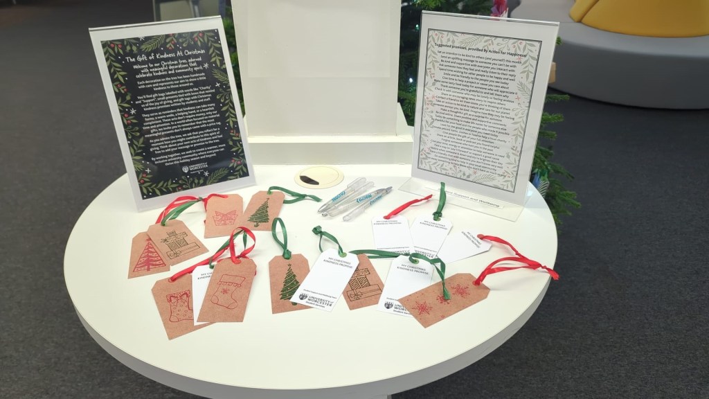 As you explore the displays at St John’s Reception, firstpoint, and in the Elizabeth Garrett Anderson building, you’ll find gift bags labelled with words like “Charity” and “Support”, small presents tied with bows that remind us of the joy of giving, and gift tags with Christmas kindness promises written by students and staff.