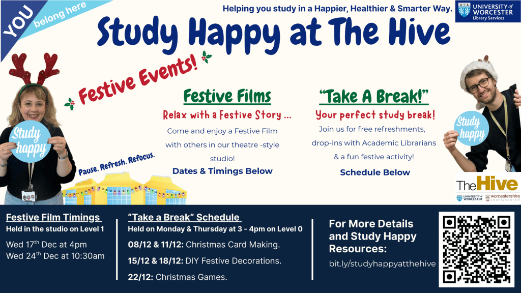 There’s also an opportunity to catch a festive film, or pick up some Study Happy resources.