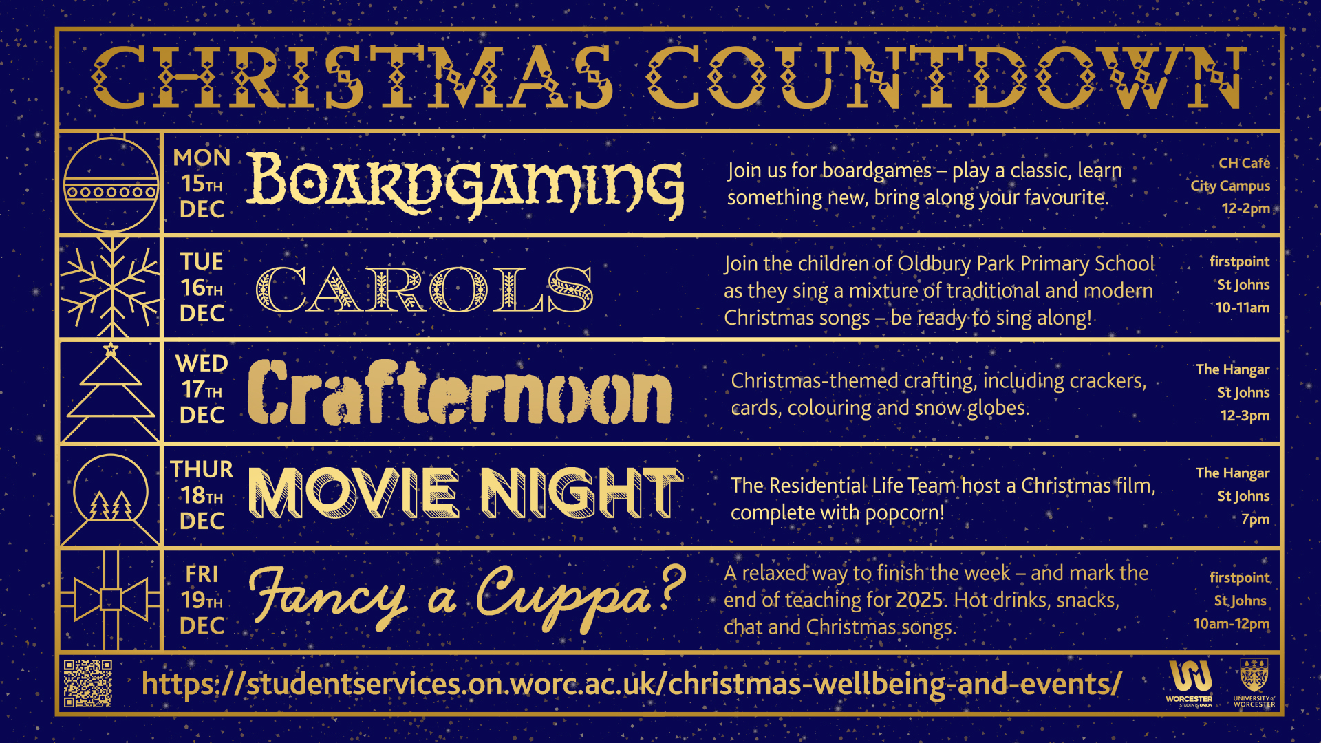 And whether you’re heading home or staying in Worcester, don’t forget to have a look at the Student Services Christmas Wellbeing and Events webpage; it has everything you need to know about University closures, festive events, and local activities.